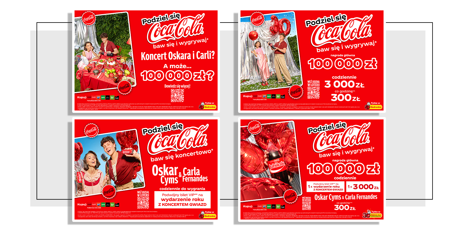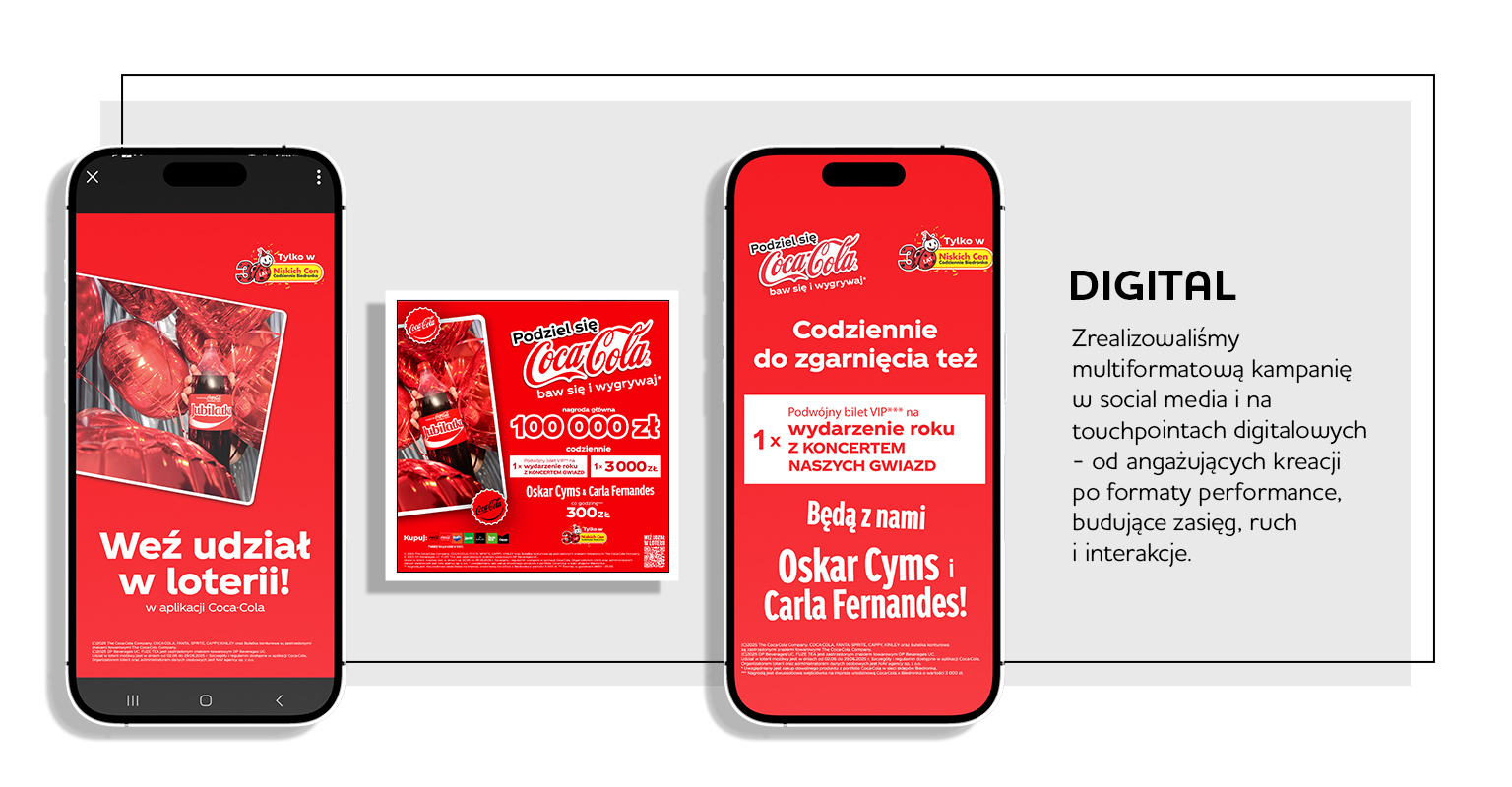 Wspólnie z Coca-Cola stworzyliśmy loterię, w której wygrywało się często, a emocje rosły z każdą chwilą. Zaprojektowaliśmy mechanikę, digital journey oraz kompleksową egzekucję kampanii instore i online.